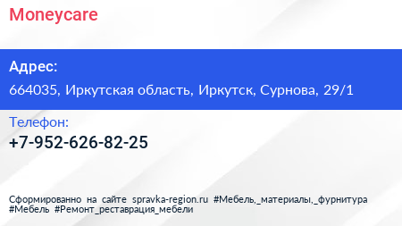 Moneycare по адресу 664035, Иркутская область, Иркутск, Сурнова, 29/1 в дальнейшем Организация, размещена в следующих категориях: