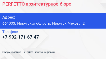 PERFETTO, архитектурное бюро по адресу 664003, Иркутская область, Иркутск, Чехова, 2 в дальнейшем Организация, размещена в следующих категориях: