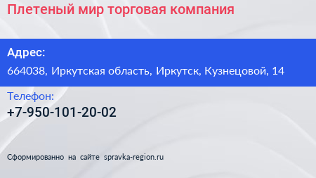 Плетеный мир, торговая компания по адресу 664038, Иркутская область, Иркутск, Кузнецовой, 14 в дальнейшем Организация, размещена в следующих категориях: