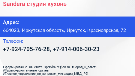 Sandera, студия кухонь по адресу 664023, Иркутская область, Иркутск, Красноярская, 72 в дальнейшем Организация, размещена в следующих категориях: