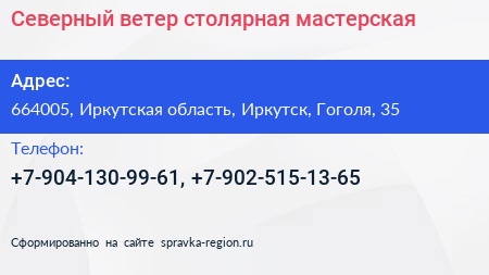 Северный ветер, столярная мастерская по адресу 664005, Иркутская область, Иркутск, Гоголя, 35 в дальнейшем Организация, размещена в следующих категориях: