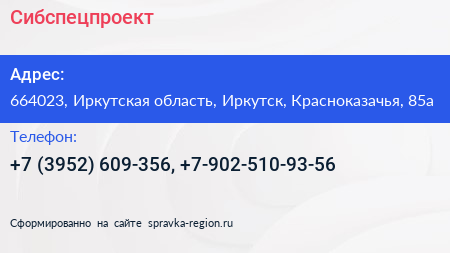 Сибспецпроект по адресу 664023, Иркутская область, Иркутск, Красноказачья, 85а в дальнейшем Организация, размещена в следующих категориях: