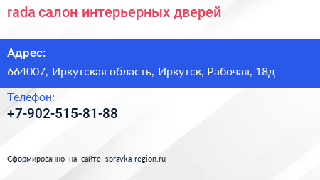 rada, салон интерьерных дверей по адресу 664007, Иркутская область, Иркутск, Рабочая, 18д в дальнейшем Организация, размещена в следующих категориях: