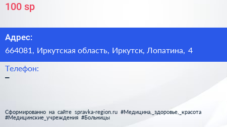100 sp по адресу 664081, Иркутская область, Иркутск, Лопатина, 4 в дальнейшем Организация, размещена в следующих категориях: