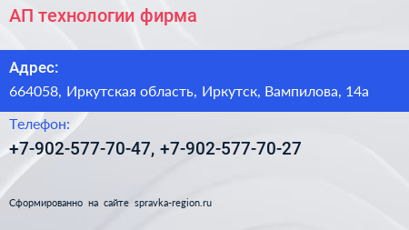 АП-технологии, фирма по адресу 664058, Иркутская область, Иркутск, Вампилова, 14а в дальнейшем Организация, размещена в следующих категориях: