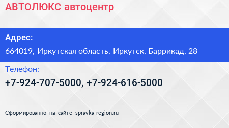 АВТОЛЮКС, автоцентр по адресу 664019, Иркутская область, Иркутск, Баррикад, 28 в дальнейшем Организация, размещена в следующих категориях: