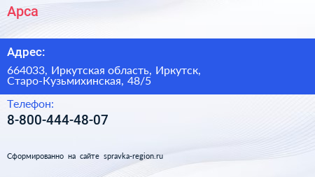 Арса по адресу 664033, Иркутская область, Иркутск, Старо-Кузьмихинская, 48/5 в дальнейшем Организация, размещена в следующих категориях: