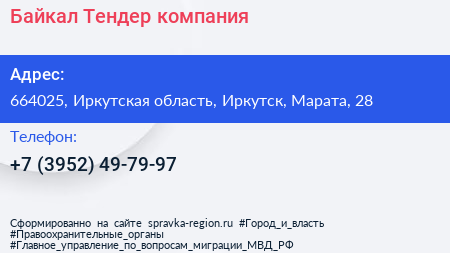 Байкал Тендер, компания по адресу 664025, Иркутская область, Иркутск, Марата, 28 в дальнейшем Организация, размещена в следующих категориях: