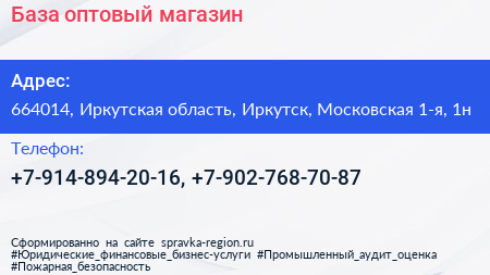База, оптовый магазин по адресу 664014, Иркутская область, Иркутск, Московская 1-я, 1н в дальнейшем Организация, размещена в следующих категориях: