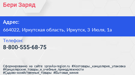 Бери Заряд по адресу 664022, Иркутская область, Иркутск, 3 Июля, 1а в дальнейшем Организация, размещена в следующих категориях: