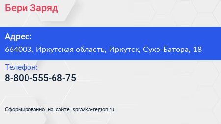 Бери Заряд по адресу 664003, Иркутская область, Иркутск, Сухэ-Батора, 18 в дальнейшем Организация, размещена в следующих категориях: