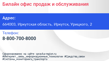 Билайн, офис продаж и обслуживания по адресу 664003, Иркутская область, Иркутск, Урицкого, 2 в дальнейшем Организация, размещена в следующих категориях: