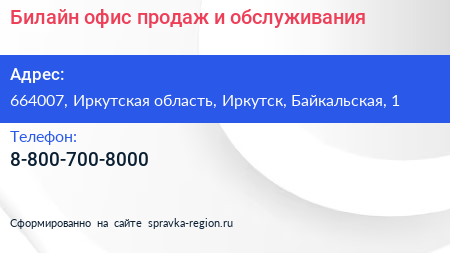 Билайн, офис продаж и обслуживания по адресу 664007, Иркутская область, Иркутск, Байкальская, 1 в дальнейшем Организация, размещена в следующих категориях: