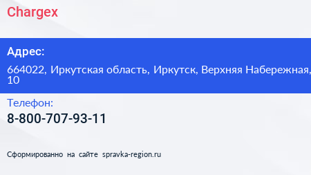 Chargex по адресу 664022, Иркутская область, Иркутск, Верхняя Набережная, 10 в дальнейшем Организация, размещена в следующих категориях: