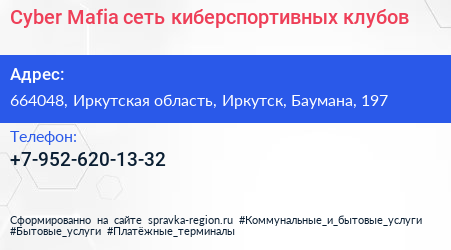 Cyber Mafia, сеть киберспортивных клубов по адресу 664048, Иркутская область, Иркутск, Баумана, 197 в дальнейшем Организация, размещена в следующих категориях: