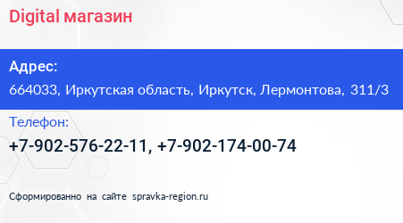 Digital, магазин по адресу 664033, Иркутская область, Иркутск, Лермонтова, 311/3 в дальнейшем Организация, размещена в следующих категориях: