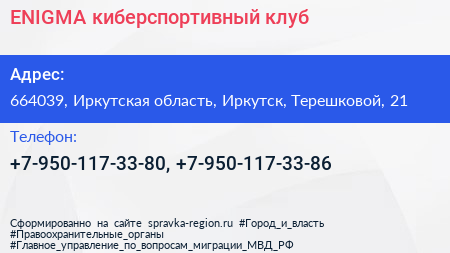 ENIGMA, киберспортивный клуб по адресу 664039, Иркутская область, Иркутск, Терешковой, 21 в дальнейшем Организация, размещена в следующих категориях: