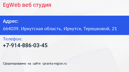 EgWeb, веб-студия по адресу 664039, Иркутская область, Иркутск, Терешковой, 21 в дальнейшем Организация, размещена в следующих категориях:
