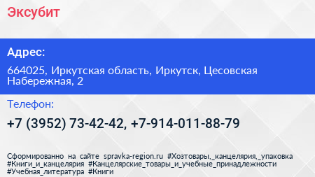 Эксубит по адресу 664025, Иркутская область, Иркутск, Цесовская Набережная, 2 в дальнейшем Организация, размещена в следующих категориях: