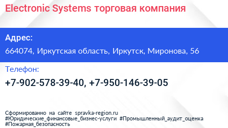 Electronic Systems, торговая компания по адресу 664074, Иркутская область, Иркутск, Миронова, 56 в дальнейшем Организация, размещена в следующих категориях: