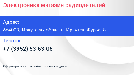 Электроника, магазин радиодеталей по адресу 664003, Иркутская область, Иркутск, Фурье, 8 в дальнейшем Организация, размещена в следующих категориях:
