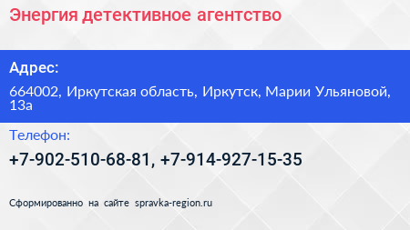 Энергия, детективное агентство по адресу 664002, Иркутская область, Иркутск, Марии Ульяновой, 13а в дальнейшем Организация, размещена в следующих категориях: