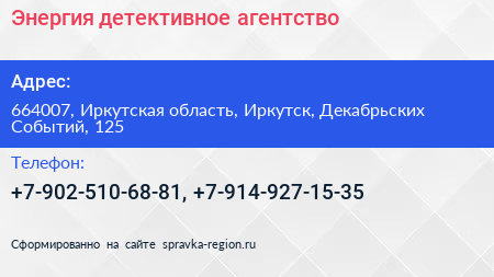 Энергия, детективное агентство по адресу 664007, Иркутская область, Иркутск, Декабрьских Событий, 125 в дальнейшем Организация, размещена в следующих категориях: