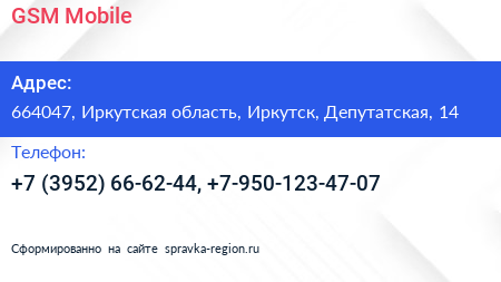 GSM Mobile по адресу 664047, Иркутская область, Иркутск, Депутатская, 14 в дальнейшем Организация, размещена в следующих категориях: