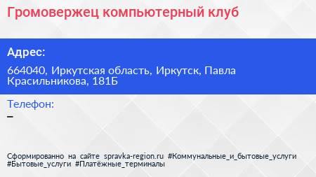 Громовержец, компьютерный клуб по адресу 664040, Иркутская область, Иркутск, Павла Красильникова, 181Б в дальнейшем Организация, размещена в следующих категориях: