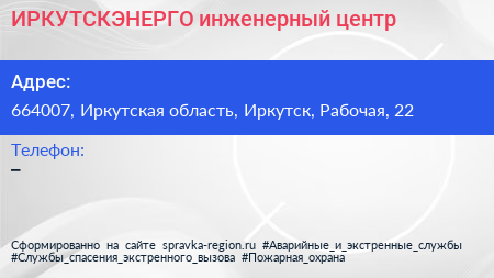 ИРКУТСКЭНЕРГО, инженерный центр по адресу 664007, Иркутская область, Иркутск, Рабочая, 22 в дальнейшем Организация, размещена в следующих категориях: