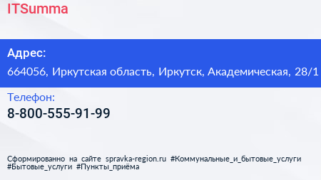 ITSumma по адресу 664056, Иркутская область, Иркутск, Академическая, 28/1 в дальнейшем Организация, размещена в следующих категориях: