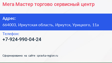 Мега Мастер, торгово-сервисный центр по адресу 664003, Иркутская область, Иркутск, Урицкого, 11а в дальнейшем Организация, размещена в следующих категориях: