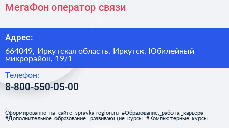 МегаФон, оператор связи по адресу 664049, Иркутская область, Иркутск, Юбилейный микрорайон, 19/1 в дальнейшем Организация, размещена в следующих категориях: