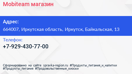 Mobiteam, магазин по адресу 664007, Иркутская область, Иркутск, Байкальская, 13 в дальнейшем Организация, размещена в следующих категориях:
