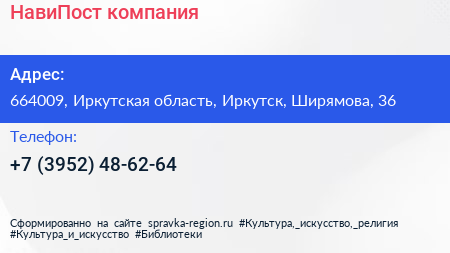 НавиПост, компания по адресу 664009, Иркутская область, Иркутск, Ширямова, 36 в дальнейшем Организация, размещена в следующих категориях: