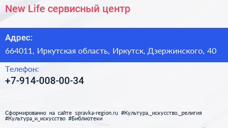 New Life, сервисный центр по адресу 664011, Иркутская область, Иркутск, Дзержинского, 40 в дальнейшем Организация, размещена в следующих категориях: