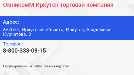 ОмникомМ-Иркутск, торговая компания по адресу 664074, Иркутская область, Иркутск, Академика Курчатова, 3 в дальнейшем Организация, размещена в следующих категориях: