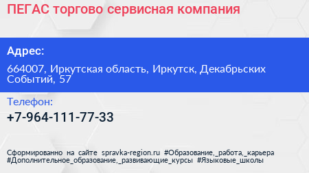 ПЕГАС, торгово-сервисная компания по адресу 664007, Иркутская область, Иркутск, Декабрьских Событий, 57 в дальнейшем Организация, размещена в следующих категориях: