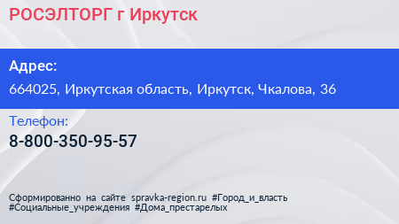 РОСЭЛТОРГ, г. Иркутск по адресу 664025, Иркутская область, Иркутск, Чкалова, 36 в дальнейшем Организация, размещена в следующих категориях: