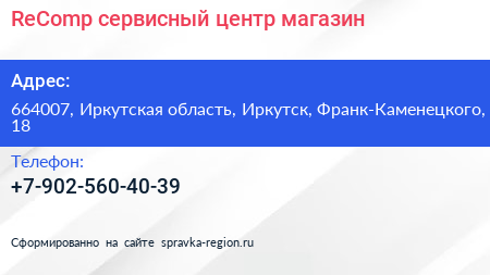 ReComp, сервисный центр-магазин по адресу 664007, Иркутская область, Иркутск, Франк-Каменецкого, 18 в дальнейшем Организация, размещена в следующих категориях: