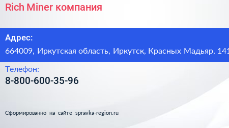 Rich Miner, компания по адресу 664009, Иркутская область, Иркутск, Красных Мадьяр, 141 в дальнейшем Организация, размещена в следующих категориях: