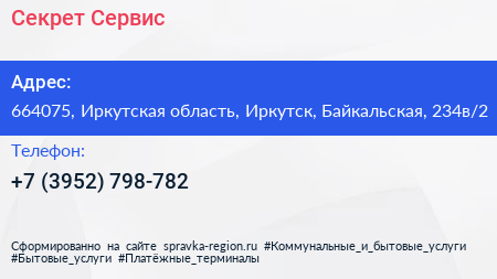 Секрет-Сервис по адресу 664075, Иркутская область, Иркутск, Байкальская, 234в/2 в дальнейшем Организация, размещена в следующих категориях: