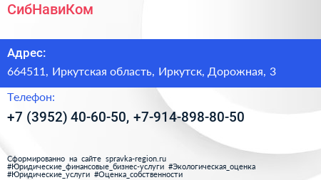 СибНавиКом по адресу 664511, Иркутская область, Иркутск, Дорожная, 3 в дальнейшем Организация, размещена в следующих категориях: