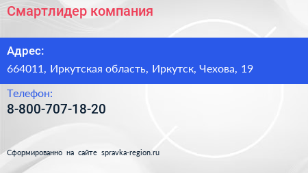 Смартлидер, компания по адресу 664011, Иркутская область, Иркутск, Чехова, 19 в дальнейшем Организация, размещена в следующих категориях: