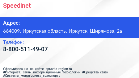 Speedinet по адресу 664009, Иркутская область, Иркутск, Ширямова, 2а в дальнейшем Организация, размещена в следующих категориях: