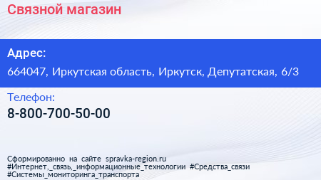 Связной, магазин по адресу 664047, Иркутская область, Иркутск, Депутатская, 6/3 в дальнейшем Организация, размещена в следующих категориях: