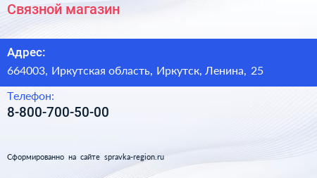 Связной, магазин по адресу 664003, Иркутская область, Иркутск, Ленина, 25 в дальнейшем Организация, размещена в следующих категориях: