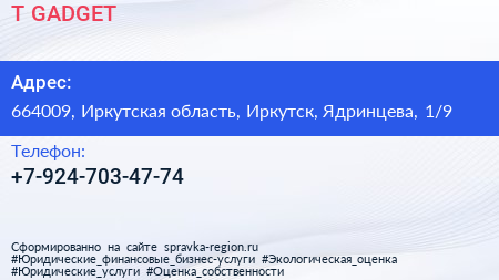 T-GADGET по адресу 664009, Иркутская область, Иркутск, Ядринцева, 1/9 в дальнейшем Организация, размещена в следующих категориях: