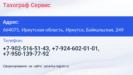 Тахограф-Сервис по адресу 664075, Иркутская область, Иркутск, Байкальская, 249 в дальнейшем Организация, размещена в следующих категориях:
