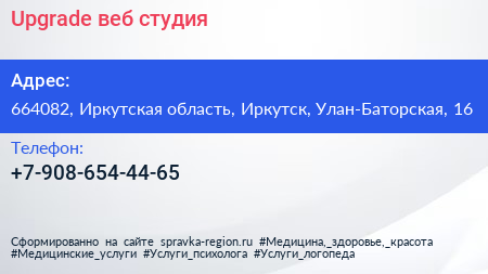 Upgrade, веб-студия по адресу 664082, Иркутская область, Иркутск, Улан-Баторская, 16 в дальнейшем Организация, размещена в следующих категориях: